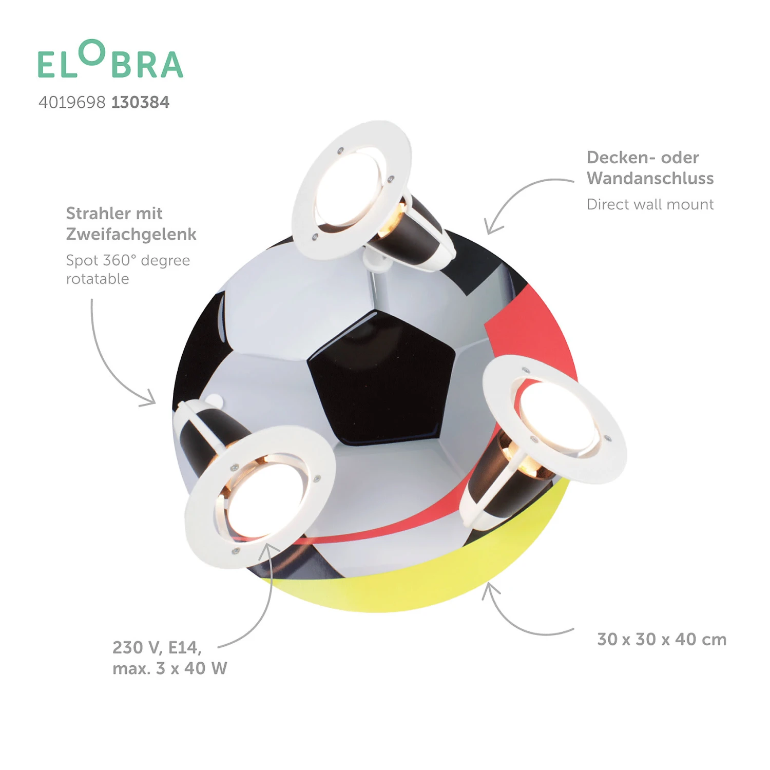 Perfektes Licht und absolutes Lieblingsdesign! Mit diesem 3er-Spot Rondell von Elobra kommt ein Hingucker in die Kinderzimmer, der dank der 3 beweglichen Spots jeden Raum perfekt ausleuchtet. Das zeitlose Design sorgt für gute Laune und das 3er-Spot Rondell kann an der Wand, oder an der Decke befestigt werden.