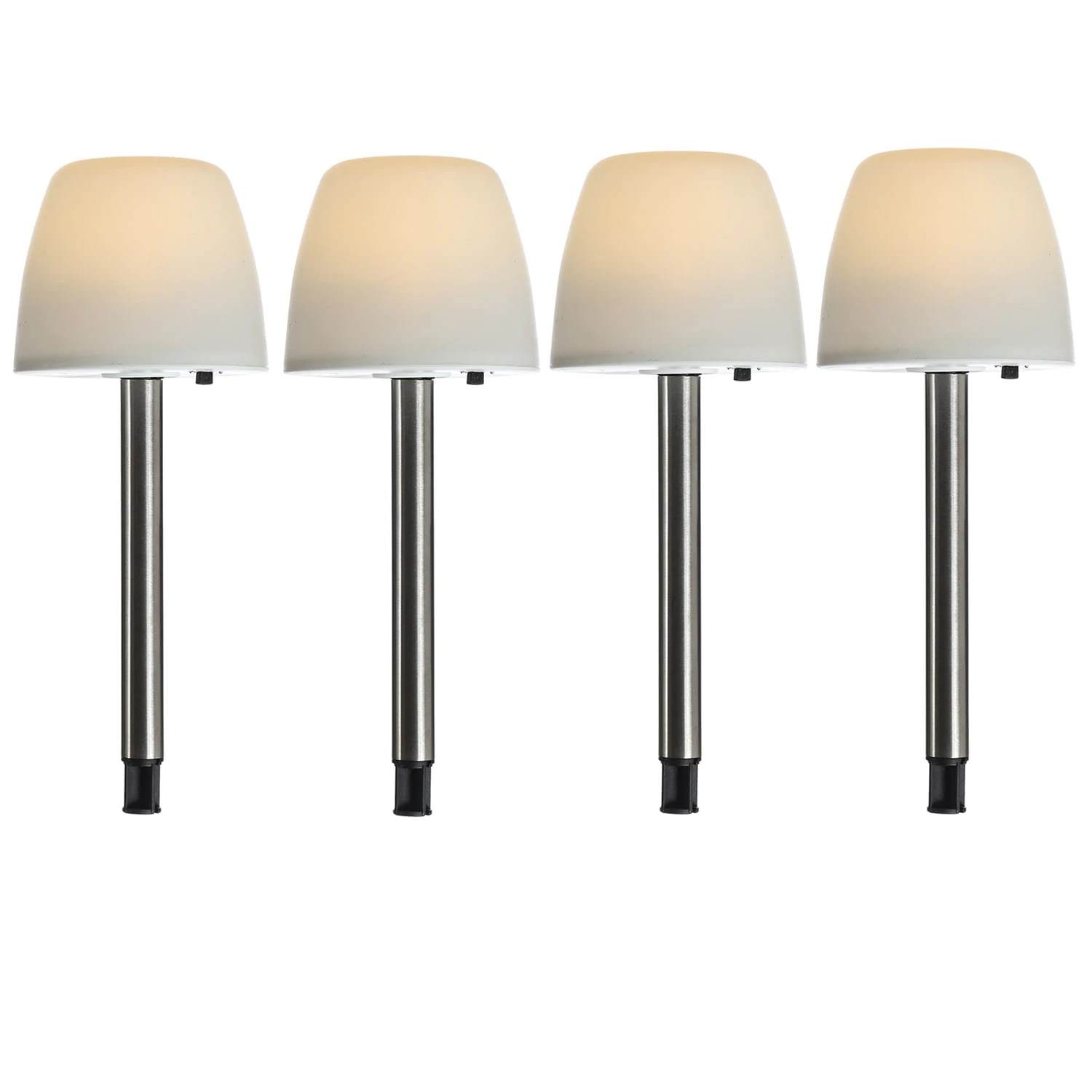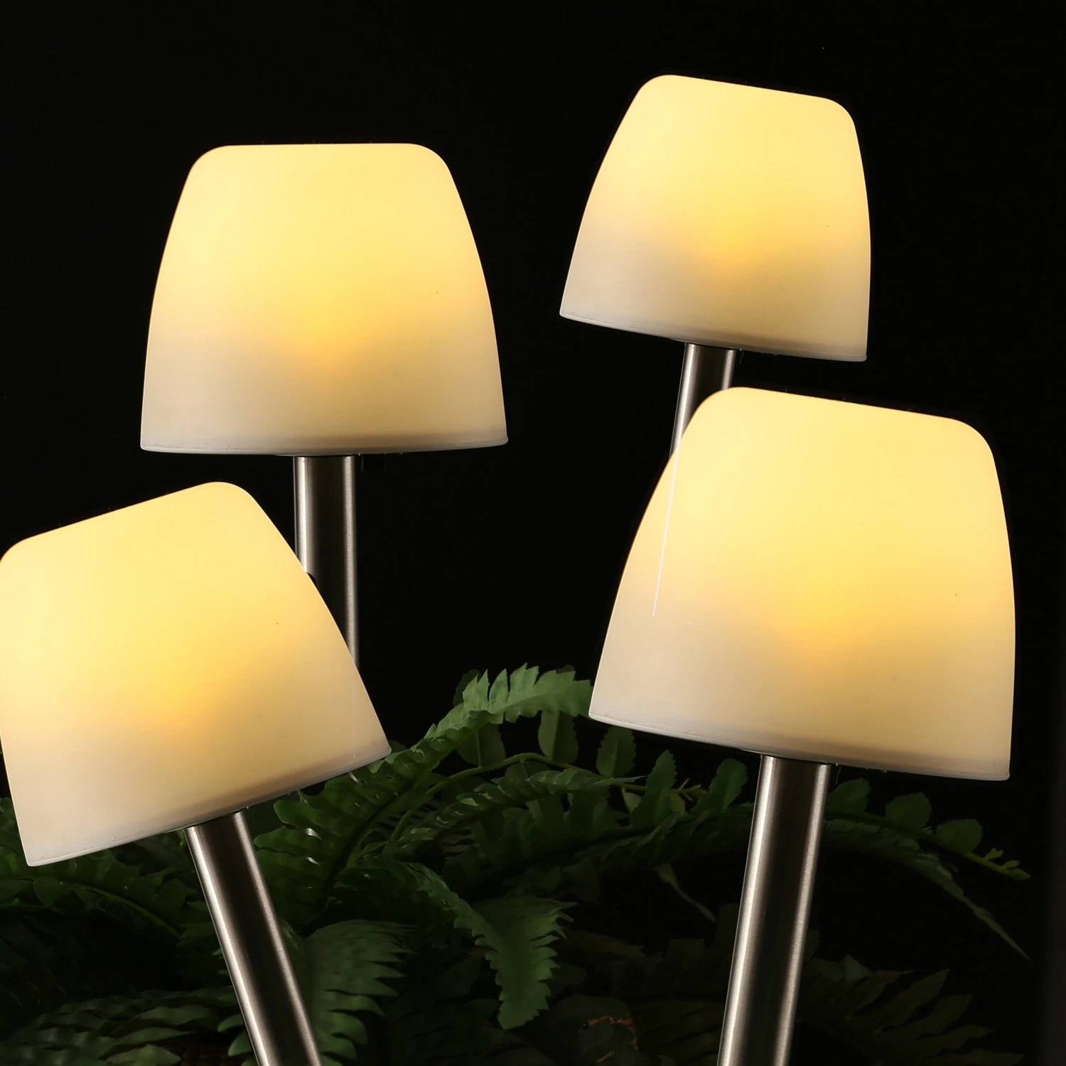 Die LED Solar Gartenleuchten mit den milchig weißen Lampenschirmen sind eine schöne Gartenbeleuchtung. Aber auch als Wegleuchte, auf der Terrasse oder dem Balkon sieht das 4er Set Solar Gartenleuchte mit dem warmweißen Licht besonders aus.