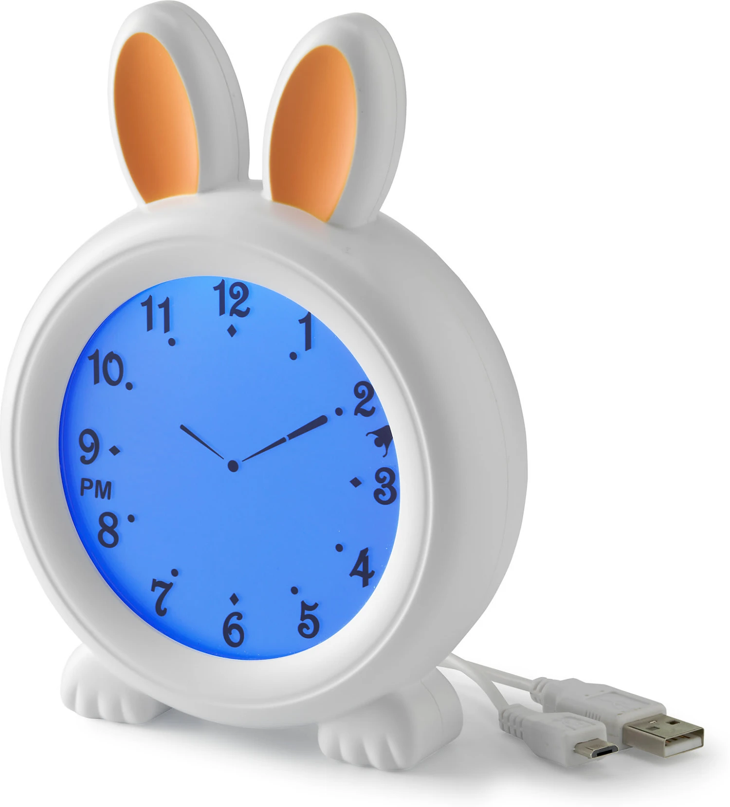 Der Alecto Schlaftrainer BC100BUNNY hat ein niedliches, kindgerechtes Weckerdesign mit Hasenohren und Füßen und bietet mehrere Optionen. Der Schlaftrainer zeigt ein orangefarbenes Licht, wenn es Zeit zum Aufstehen ist, und ein blaues Licht, wenn es Zeit zum Schlafen ist. Die Zeit ist einstellbar, so dass der Schlaftrainer auch als Wecker genutzt werden kann. Die Farbintensität des Nachtlichts ist in 7 Stufen einstellbar. Der Schlaftrainer kann mit dem mitgelieferten USB-Kabel aufgeladen werden. Nach dem Aufladen ist der Schlaftrainer schnurlos und somit leicht zu bewegen.
