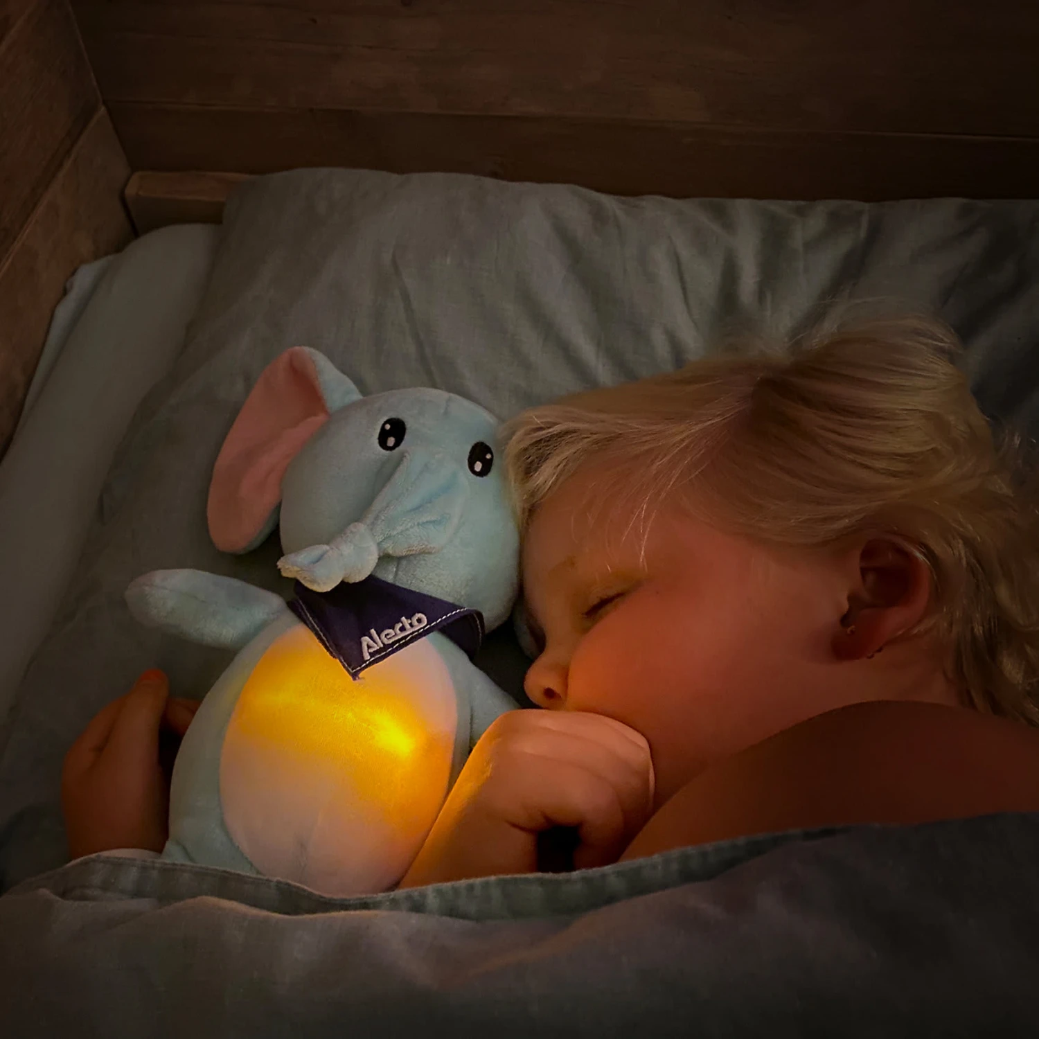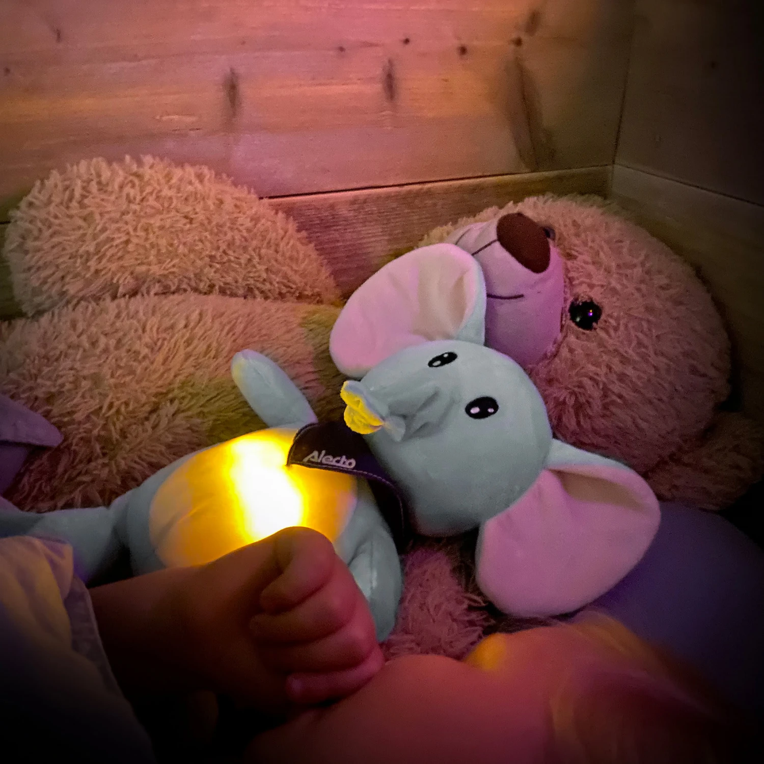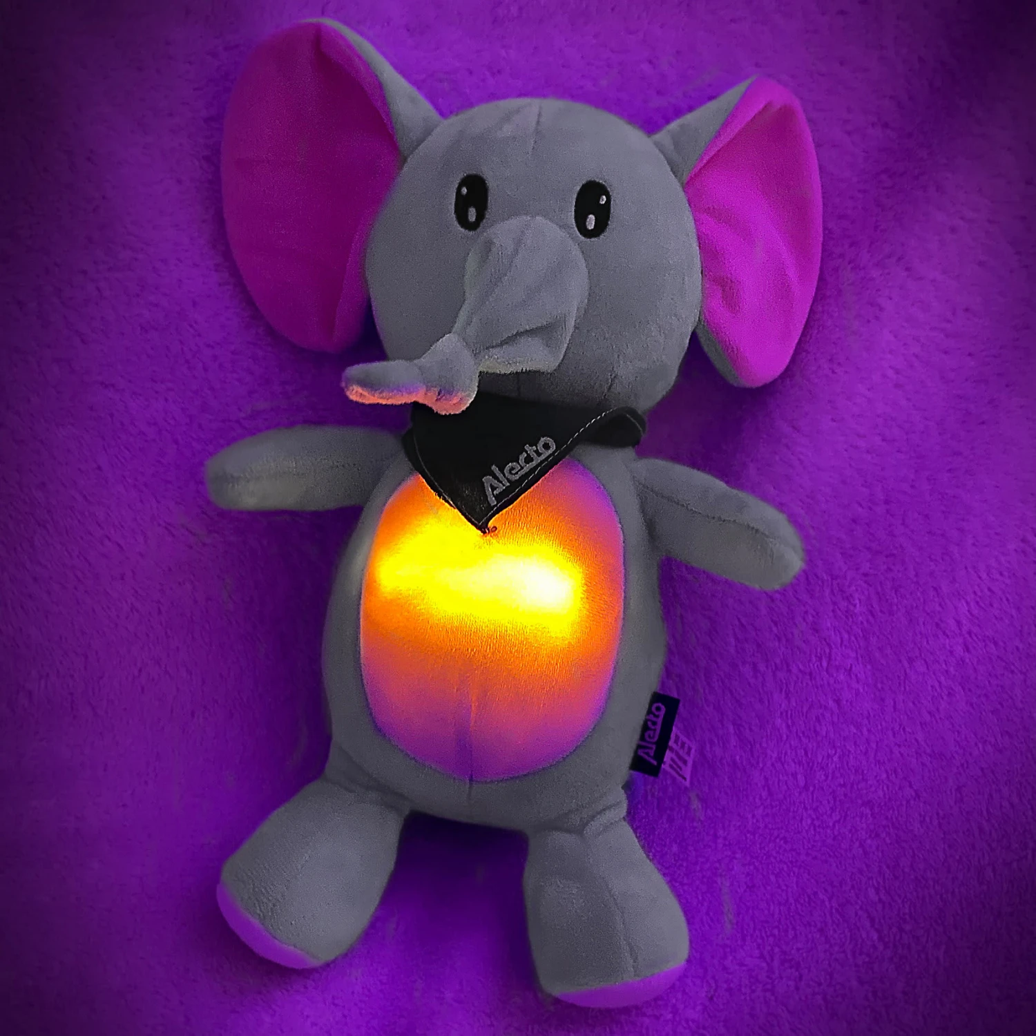 Der Alecto BC350 ist ein 3-in-1-Plüschtier, das Ihrem Kind hilft, ruhig und bequem einzuschlafen. Ein schönes, weiches Spielzeug mit einem eingebauten Nachtlicht im Bauchraum und beruhigenden Klängen. Was kann sich Ihr Kind mehr wünschen? Das Kuscheltier hat die Form eines niedlichen Elefanten, den Ihr Kind ganz nah bei sich halten kann. Im Bauch befindet sich ein Nachtlicht, das durch Drücken der Pfote eingeschaltet wird. Um Energie zu sparen, schaltet sich das Licht nach 30 Minuten automatisch aus. Die Farbintensität des Nachtlichts ist durch erneutes Drücken des Fußes einstellbar (3 Stufen + aus). Außerdem ist dieses schöne Kuscheltier mit 4 beruhigenden Schlafliedern und Klängen ausgestattet, die Ihrem Kind ein angenehmes und sicheres Gefühl geben. Denken Sie an Geräusche wie leichten Regen oder einen Herzschlag. Alle Schlaflieder und Klänge sind für 15 Minuten aktiviert, danach schalten sie sich automatisch ab. Die Lautstärke ist ebenfalls leicht einstellbar (3 Stufen + aus). Ein schönes Detail ist, dass der Alecto BC-350 mit einem Geräuschsensor ausgestattet ist. Sobald dieser Modus und damit der Geräuschsensor aktiviert ist, spielt das Kuscheltier bei Erkennung eines Geräusches automatisch 15 Minuten lang Schlaflieder oder Klänge ab, damit Ihr Kind wieder von alleine einschlafen kann. Ohne Hilfe von Mama oder Papa. Danach bleibt der Sensor für 3 Stunden aktiv und schaltet sich erst dann wieder komplett ab. Der BC350 arbeitet mit 3x AA-Batterien, die leicht zu ersetzen sind. Sie entscheiden, welche Optionen Sie wünschen. Zusammen mit der automatischen Abschaltung nach einer gewissen Zeit halten die Batterien besonders lange. Das Stofftier ist auch für die Kleinsten geeignet, also ab 0 Jahren. Die Abmessungen des BC350 – Elefant-Plüschtiers (34 x 24 x 12 cm) sind angenehm, so dass sowohl jüngere als auch ältere Kinder darin einen guten Kumpel finden werden. Der BC350 besteht aus einem strapazierfähigen Material, das mit einem leicht feuchten Tuch leicht zu reinigen ist.