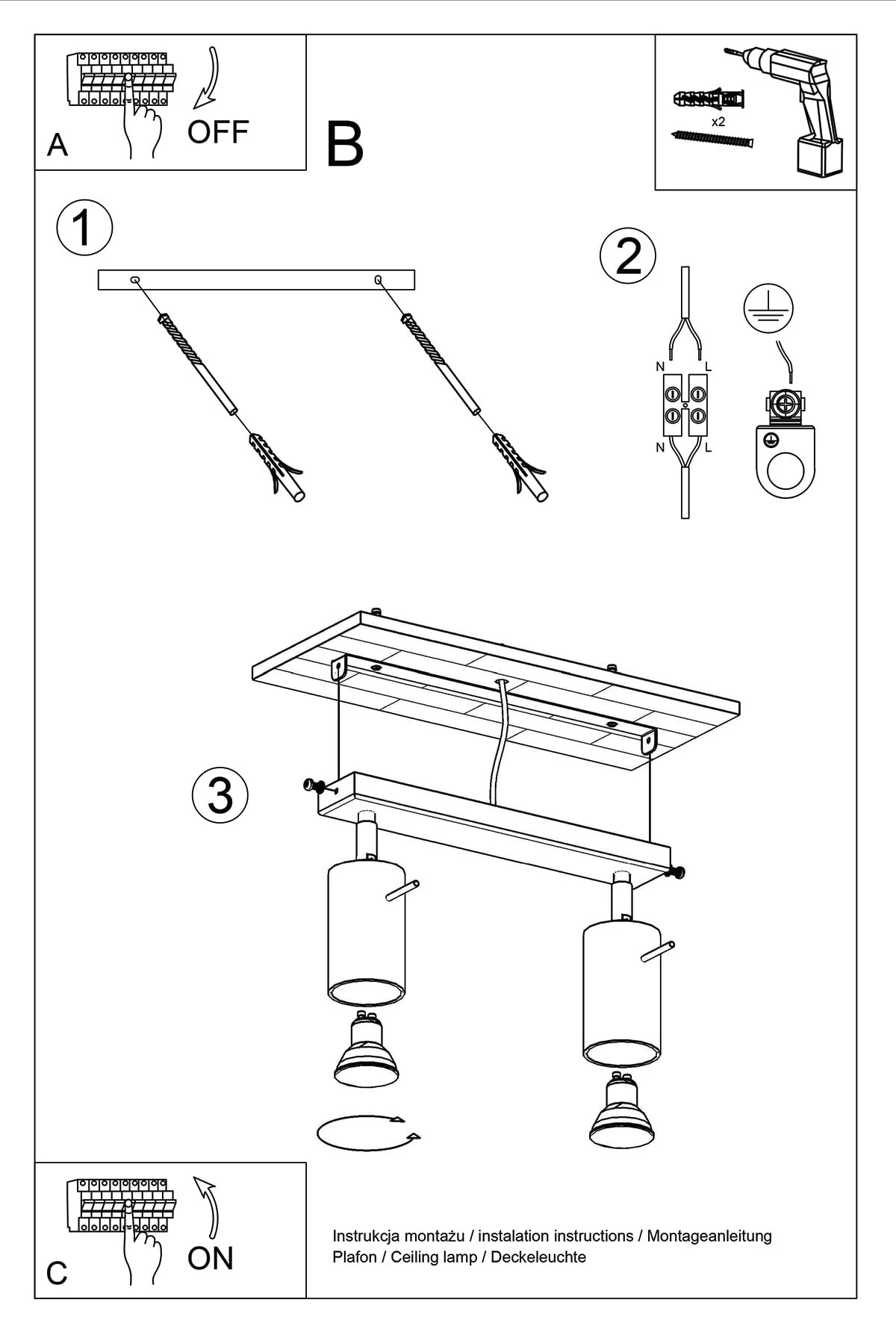 Leuchtmittel: GU10, 2x40W, 2x12W LED, 50-60Hz, ~220-230V, IP20, Schutzklasse I