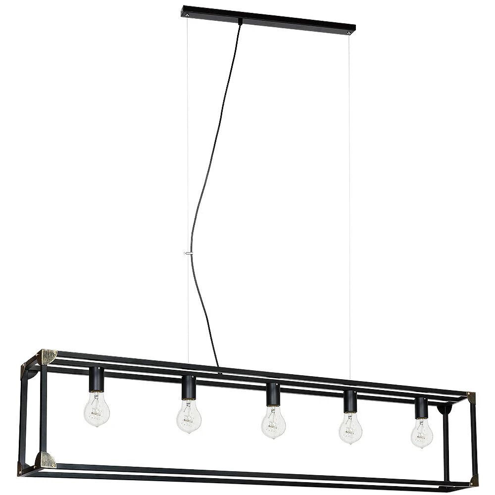 Fassung: 5x E27 bis 60 Watt | Farbe: Schwarz, Antik-Gold | Material: Metall | Spannung: 230V | Spritzschutzklasse:IP20 | Hängeleuchte in modern minimalistischem Design | elegante und moderne Stahlseilaufhängung | Rechteckige Leuchte