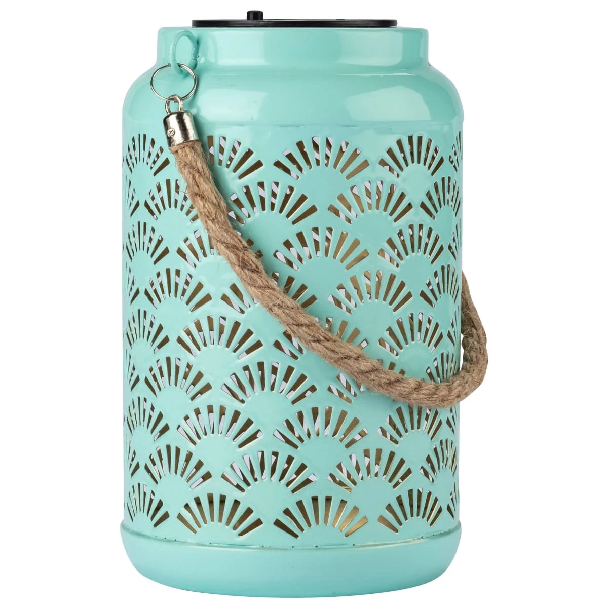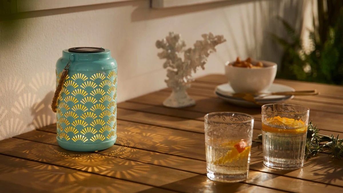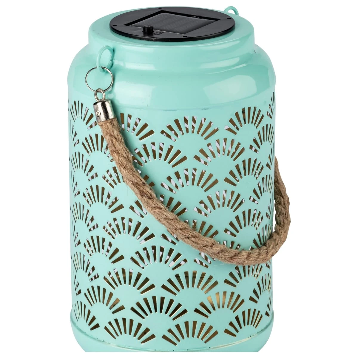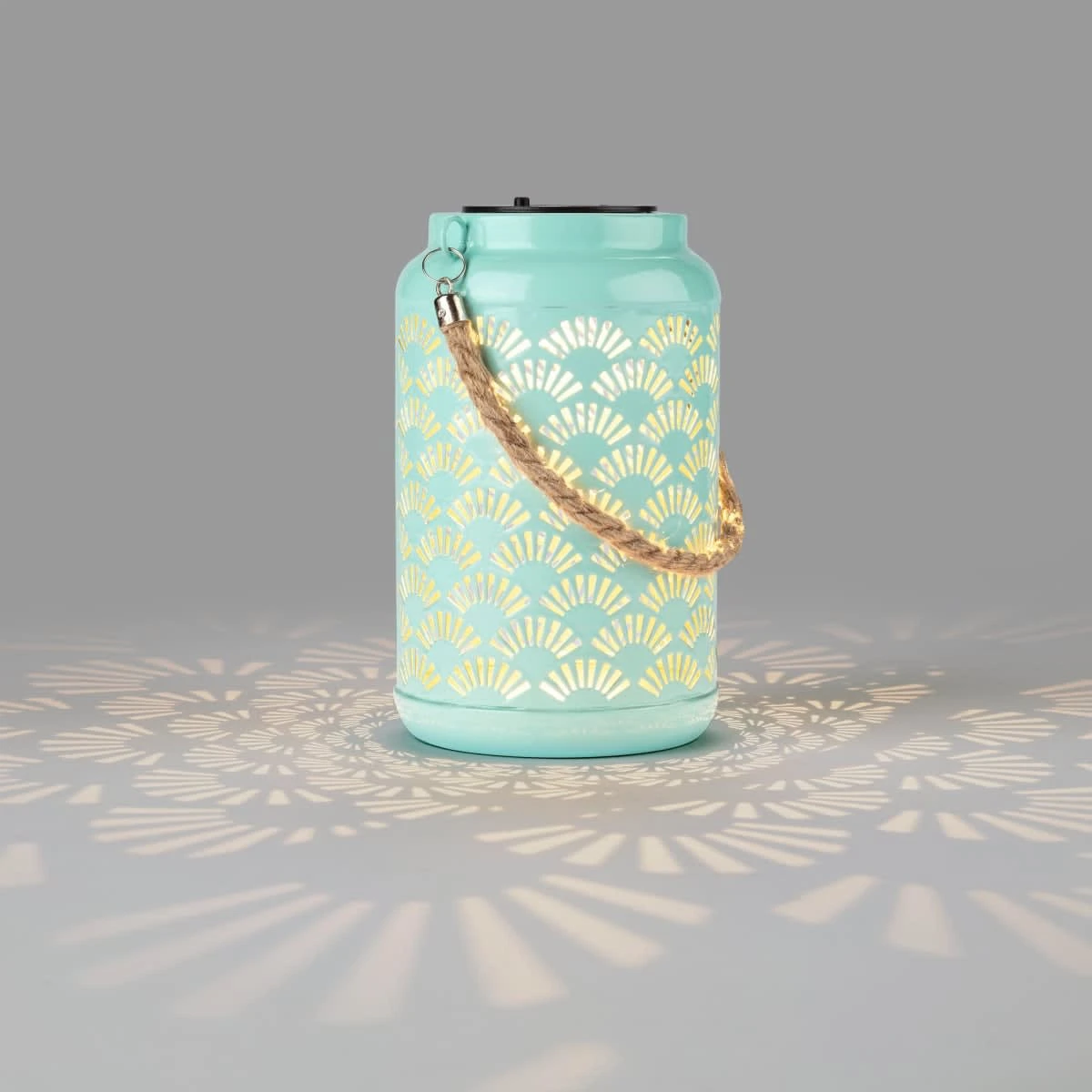 Die mintfarbene Solar-Laterne sorgt für stimmungsvolle Beleuchtung in den Abendstunden. Aber auch tagsüber ist die Solarleuchte ein schöner Blickfang und ein tolles Deko-Accessoire für den Außenbereich.