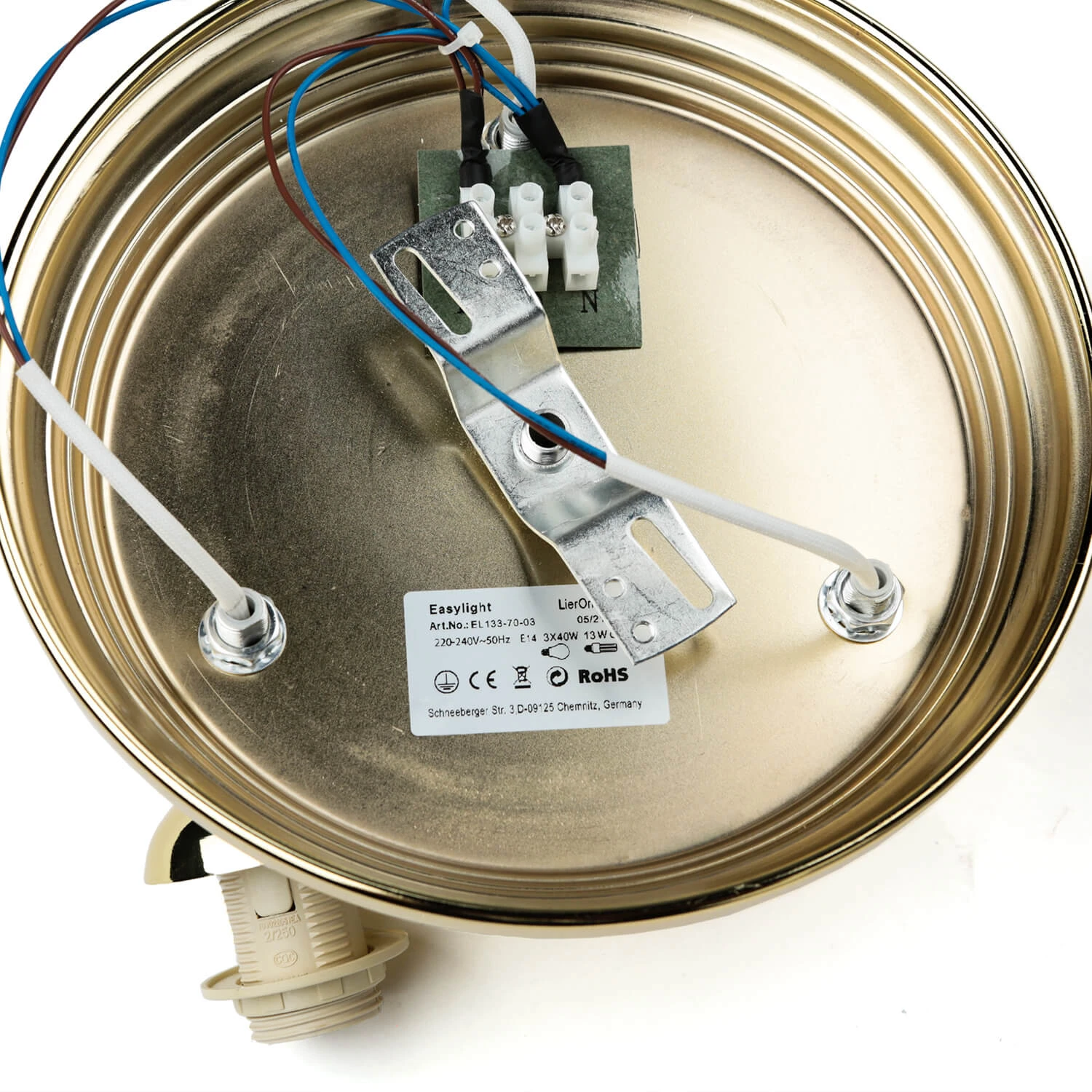 Fassung: E14 R50 3x MAX 40W | Farbe: Gold, Weiß | Material: Metall, Glas | Spannung: 230V | Spritzschutzklasse:IP20 | Elegante Jugendstil Deckenlampe für das Badezimmer | Die dreh- und schwenkbaren Lampenschirme aus satiniertem Glas erlauben eine zielgerichtete Beleuchtung | Das stilvolle Design ist vielseitig, sodass der Deckenstrahler auch in Wohnzimmer, Küche und Flur für ein wohnliches Ambiente sorgt | Der Farbton Gold setzt einen edlen Akzent, der sich wunderbar in viele Wohnstile einfügt | Freie Leuchtmittelwahl: Helligkeit und Lichtfarbe können durch LED-Leuchtmittel variiert und auf jeden Raum abgestimmt werden | nicht inklusive | Ø Deckenhalterung: 200 mm | Die Bilder zeigen Tag- und Nachtaufnahmen, daher können die Farben auf den Abbildungen variieren