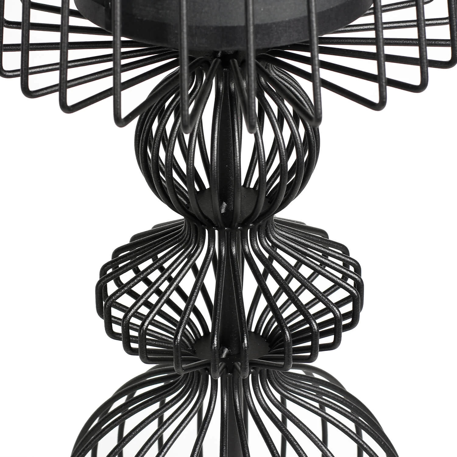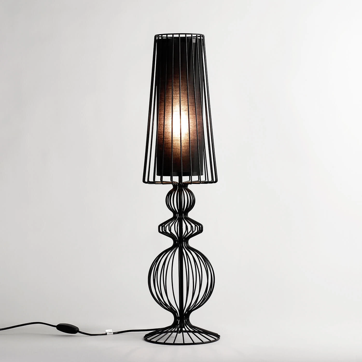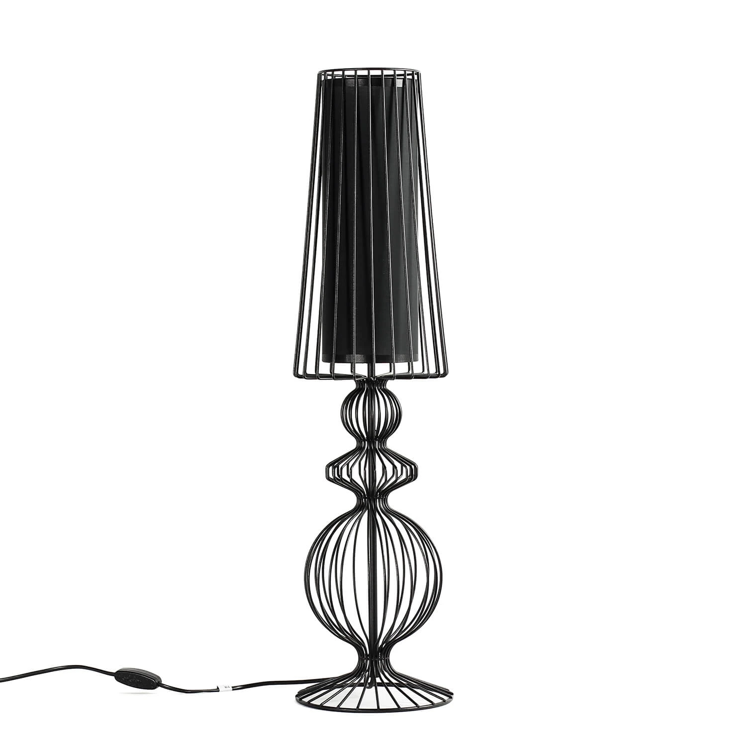 Fassung: E27 max. 40W | Farbe: Schwarz | Material: lackierter Stahl, Stoff | Spannung: 230V | Spritzschutzklasse:IP20 | Diese besondere Tischleuchte zieht durch ihr ausgefallenes Design die Blicke auf sich | Das Gestell besteht aus Metallstreben, die durch ihre Form die Silhouette einer klassischen Tischleuchte beschreiben | Der Schirm sitzt sicher im inneren der filigranen Konstruktion, wodurch ein besonderer Beleuchtungseffekt entsteht | Durch den offenen Schirm kann die Wirkung dieser Hängeleuchte mit einem entsprechendem Leuchtmittel verändert werden, zum Beispiel mit einem LED Filament Leuchtmittel in Edison-Form | bitte beachten Sie bei der Wahl des entsprechenden Leuchtmittels den geringen Durchmesser des Schirms (Ø 18mm)